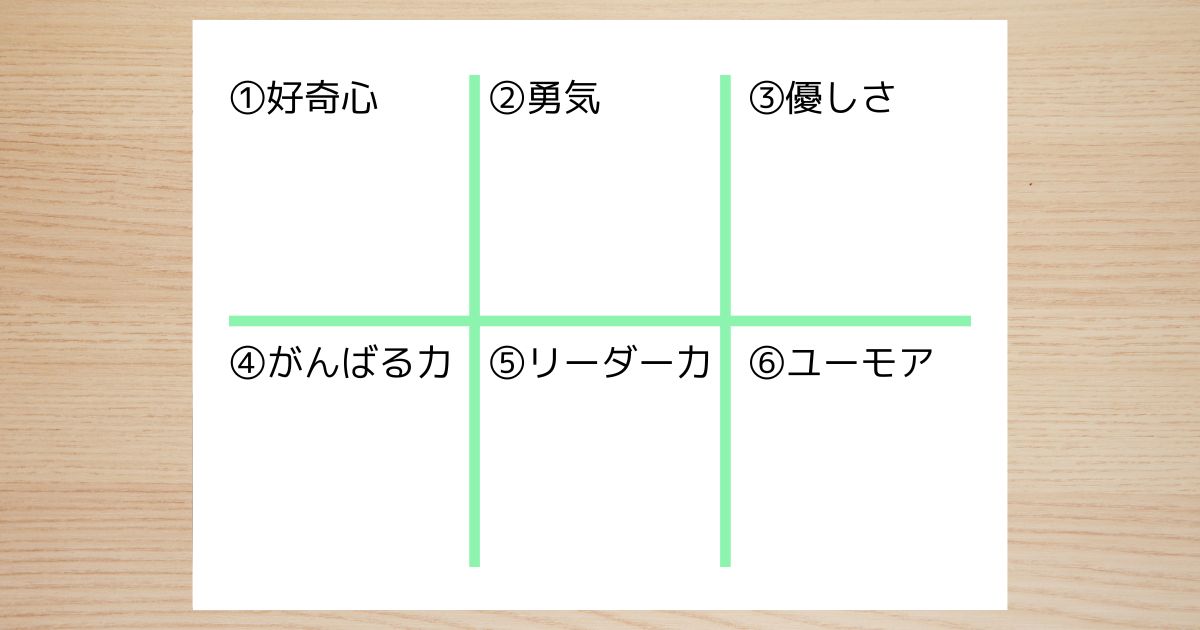 強みの候補が出そろったら、見開きページに6〜8個の枠をつくり、それぞれに名前をつけます。