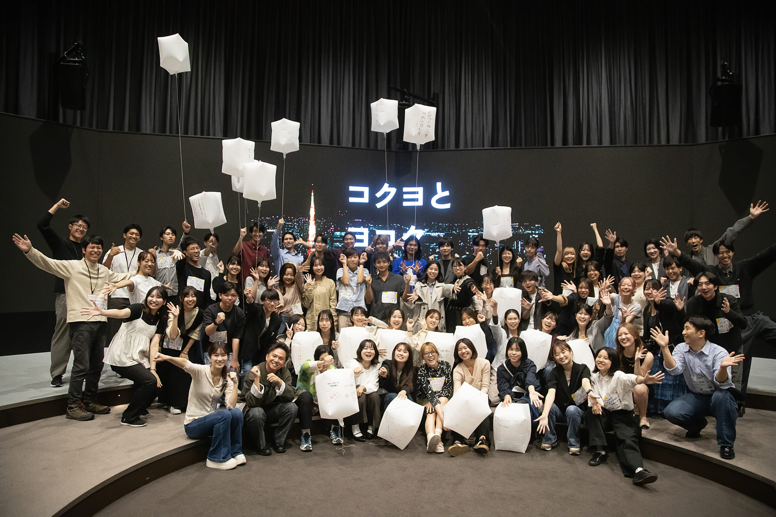 「ヨコク式」は、2025年10月14日に行われた、学生たちが自分の未来への意志(=ヨコク)を宣言するプロジェクトです。企画、プログラムの内容決定、準備、そして当日の運営のすべてが、学生主導で行われています。運営チームは総勢20名ほど。当日は、80名の学生たちが全国から集まり、自分たちの意志=ヨコクを宣言してフィナーレとなりました。